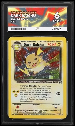 Pokemon Dark Raichu Team Rocket Holo Card 83/82 Ace Grading 6 Perfect Centering | 83/82 | 6 | £95.00 | £22.99 | +£72.01 | +313.2% | 2026-04-14 | View listing | ||