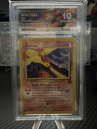 2000 Moltres Black Star Promo #21 Ace Grading GEM MINT 10 Error | PROMO21 | 10 | No | £95.00 | £0.19 | +£94.81 | +49900.0% | 2026-04-14 | View listing | |