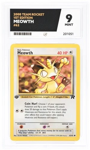 MEOWTH 1ST EDITION TEAM ROCKET 62/82 2000 VINTAGE WOTC ACE GRADING MINT 9 | 62/82 | 9 | No | £22.00 | £0.02 | +£21.98 | +109900.0% | 2026-02-21 | View listing | |